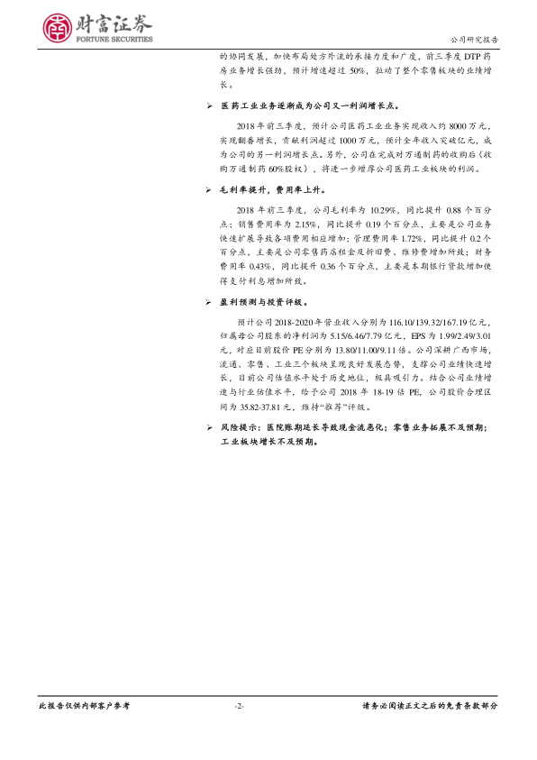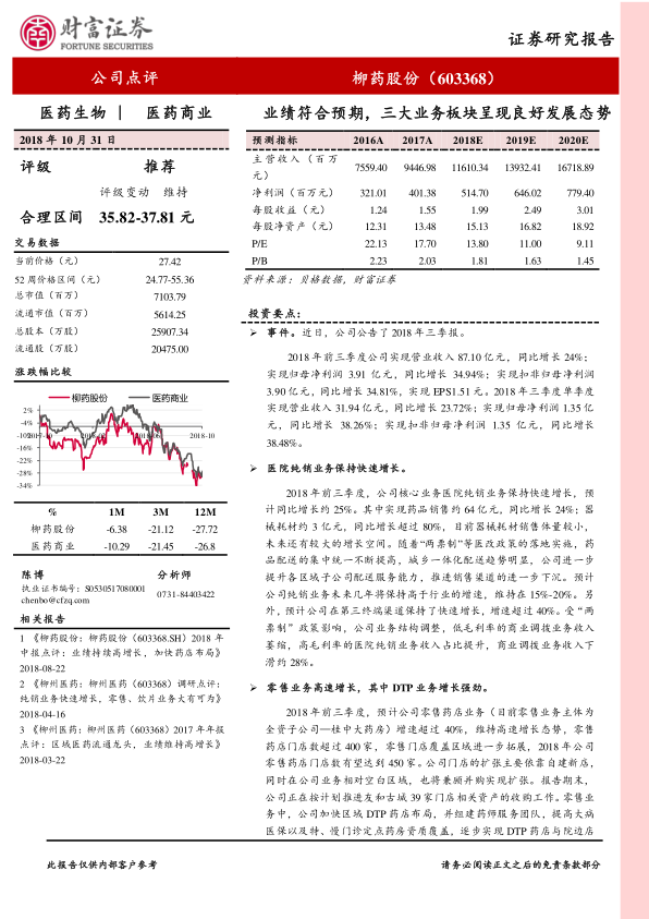 本报告对柳药股份2018年三季报进行了深入分析,认为公司业绩符合预期,三大业务板块呈现良好发展态势。医院纯销业务稳健增长,零售业务高速扩张,医药工业业务成为新的利润增长点。公司毛利率提升,但费用率也有所上升。报告维持“推荐”评级,并提示了相关风险。总体而言,柳药股份深耕广西市场,估值水平具有吸引力,值得投资者关注。