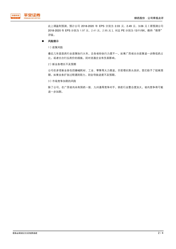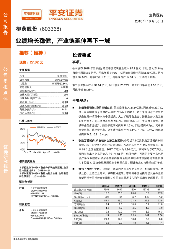 本报告分析了柳药股份2018年三季报,指出公司业绩增长稳健,符合预期,并通过收购万通制药向上游产业链延伸,增强了竞争力。报告维持对柳药股份的“推荐”评级,并上调了盈利预测。同时,报告也提示了政策风险、新业务增长不及预期以及市场竞争加剧的风险。总体而言,柳药股份作为广西省内医药商业龙头企业,在市场集中度提升和业务延伸的推动下,有望维持持续高速增长。