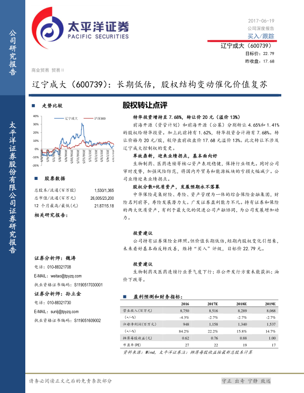 本报告分析了辽宁成大(600739)的股权结构变动、基本面情况以及未来发展潜力。特华投资的增持可能催化公司价值的复苏,公司核心资产稳健,风险防范措施有效,业绩迎来拐点。公司持有中华保险和广发证券两大优质资产,有利于促进产融协同,为公司发展增加动力。维持“买入”评级,目标价22.79元。