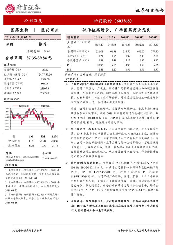 柳药股份作为深耕广西的医药商业龙头,凭借其在区域市场的稳固地位和“批发+零售”双轮驱动战略,实现了持续且高于行业平均水平的业绩增长。公司通过优化批发业务结构、提升纯销占比,并加速零售药店扩张、积极布局DTP业务以承接处方外流,巩固了其商业板块的增长动能。同时,公司积极向上游医药工业延伸,通过发展中药饮片业务和战略性收购万通制药,成功培育了新的利润增长点,进一步优化了产业结构。尽管面临行业政策和市场竞争的挑战,公司通过精细化管理和创新经营策略,有效提升了盈利能力和市场份额。当前,公司估值处于历史低位,结合其强劲的业绩增长潜力和清晰的业务发展战略,具备显著的投资吸引力。基于对公司未来业绩的积极展望,本报告维持对柳药股份的“推荐”评级。