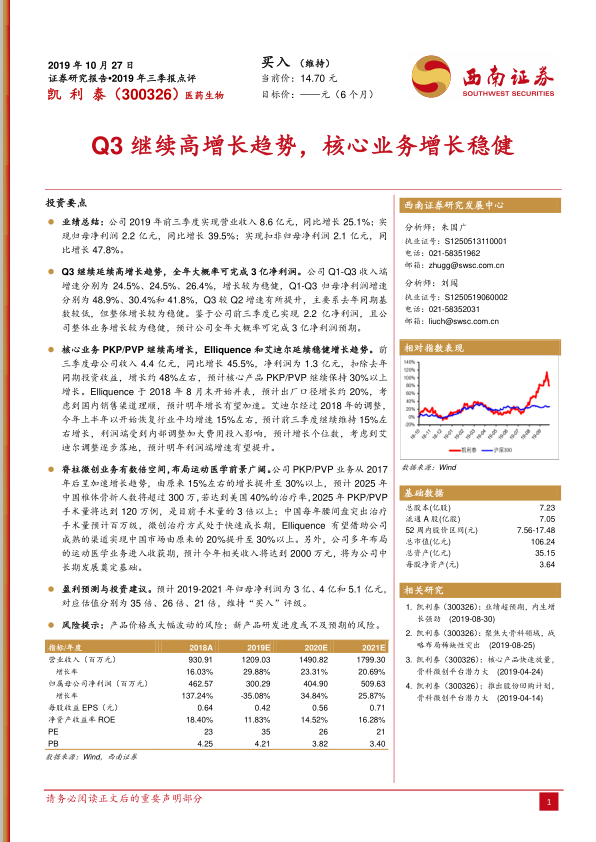 本报告分析指出,凯利泰 2019 年前三季度业绩表现稳健,核心业务增长强劲,多元化布局为未来发展提供动力。公司全年有望完成盈利目标,维持“买入”评级。同时,报告也提示了产品价格波动和新产品研发进度不及预期的风险。