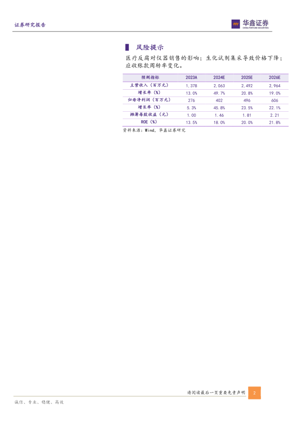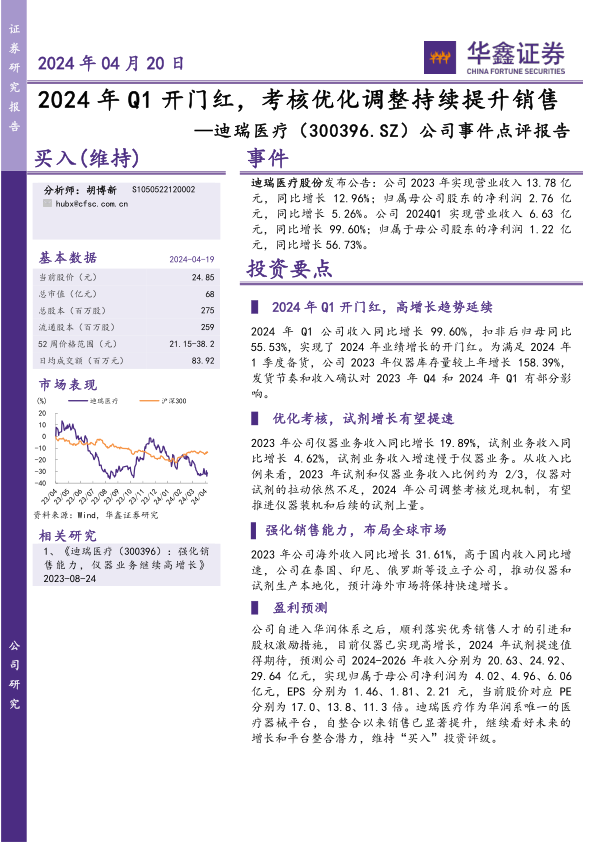 公司自进入华润体系之后,顺利落实优秀销售人才的引进和股权激励措施,目前仪器已实现高增长,2024年试剂提速值得期待,预测公司2024-2026年收入分别为20.63、24.92、29.64亿元,实现归属于母公司净利润为4.02、4.96、6.06亿元,EPS分别为1.46、1.81、2.21元,当前股价对应PE分别为17.0、13.8、11.3倍。迪瑞医疗作为华润系唯一的医疗器械平台,自整合以来销售已显著提升,继续看好未来的增长和平台整合潜力,维持“买入”投资评级。