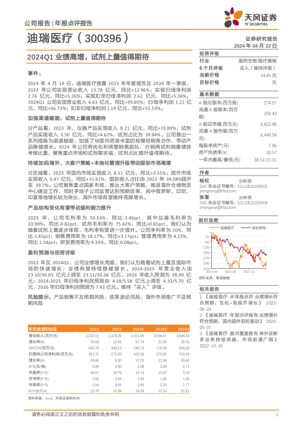 2023年及2024Q1,公司业绩增长亮眼,我们认为随着试剂上量及国际市场的快速增长,业绩有望持续稳健增长。2024-2025年营业收入由23.10/30.03亿元上调至23.11/30.36亿元,2026年收入预测为38.49亿元;2024-2025年归母净利润预测由4.18/5.58亿元上调至4.33/5.70亿元,2026年归母净利润预测为7.43亿元。维持“买入”评级。