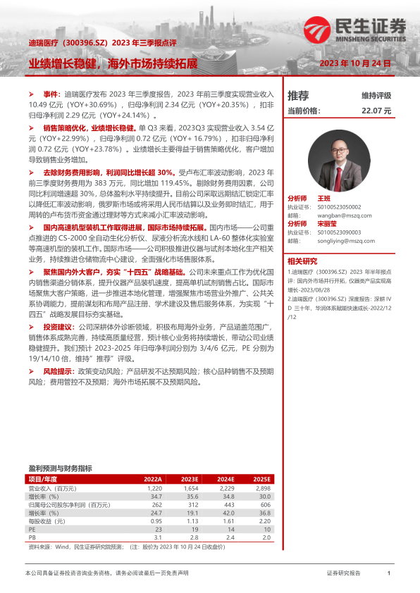 投资建议:公司深耕体外诊断领域,积极布局海外业务,产品涵盖范围广,销售体系成熟完善,持续高质量经营,预计核心业务将持续增长,带动公司业绩稳健提升。我们预计2023-2025年归母净利润分别为3/4/6亿元,PE分别为19/14/10倍,维持”推荐”评级。