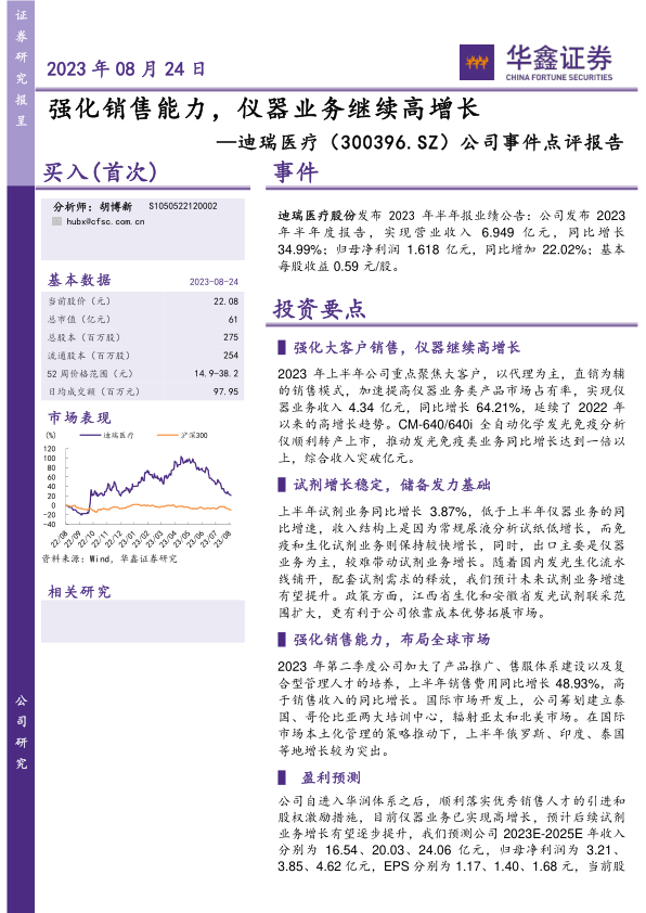 迪瑞医疗在2023年上半年展现出强劲的业绩增长,主要得益于其仪器业务的显著扩张和销售能力的持续强化。公司通过聚焦大客户、推出新产品以及积极拓展全球市场,成功驱动了营收和利润的双重增长。尽管试剂业务增速相对平稳,但未来有望在政策和市场扩张的推动下实现加速。分析师基于公司在华润体系内的战略地位和已取得的销售成效,对其未来增长潜力持积极态度,并给予“买入”评级。然而,投资者仍需关注股权激励、医疗反腐、集采降价及应收账款等潜在风险。