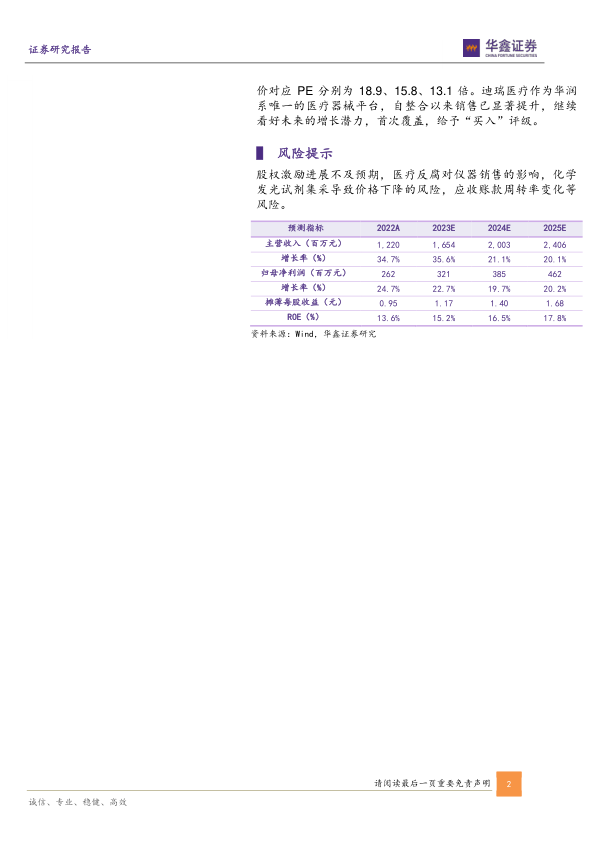 公司自进入华润体系之后,顺利落实优秀销售人才的引进和股权激励措施,目前仪器业务已实现高增长,预计后续试剂业务增长有望逐步提升,我们预测公司2023E-2025E年收入分别为16.54、20.03、24.06亿元,归母净利润为3.21、3.85、4.62亿元,EPS分别为1.17、1.40、1.68元,当前股价对应PE分别为18.9、15.8、13.1倍。迪瑞医疗作为华润系唯一的医疗器械平台,自整合以来销售已显著提升,继续看好未来的增长潜力,首次覆盖,给予“买入”评级。