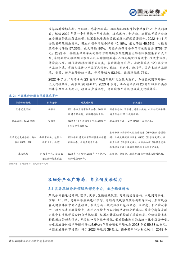 据中商产业研究院预测,我国体外诊断市场规模由2023年的1698亿元增长到2027年的2428亿元,年均复合增长率7.4%。迪瑞医疗全面布局IVD七大板块,并持续加大装机力度,2023上半年仪器收入达4.34亿元,同比增长64.21%,随仪器占有率的提升,试剂营收有望迎来快速增长。从细分领域来看,公司具备尿液分析领域头部竞争力,业务有望稳健增长;高速生化分析仪竞争力强劲,产品进军顶端市场,市占率有望持续提升;化学发光基数较低,加速进口取代,已经成为新的增长点;LA-60系统带动整体化实验室业务,配合国产化政策支持,持续贡献业绩增量。