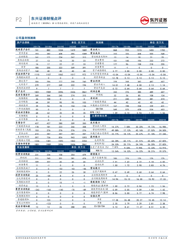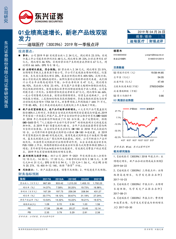 本报告分析了迪瑞医疗2019年第一季度的财务业绩,指出公司Q1业绩增长提速,主要得益于母公司业绩的贡献和新老产品线的双轮驱动。报告预计公司全年业绩将保持高速增长。