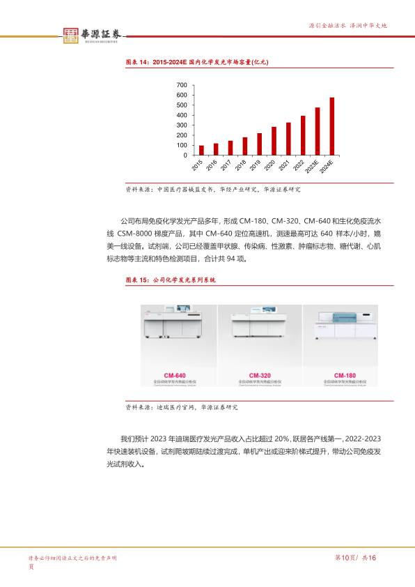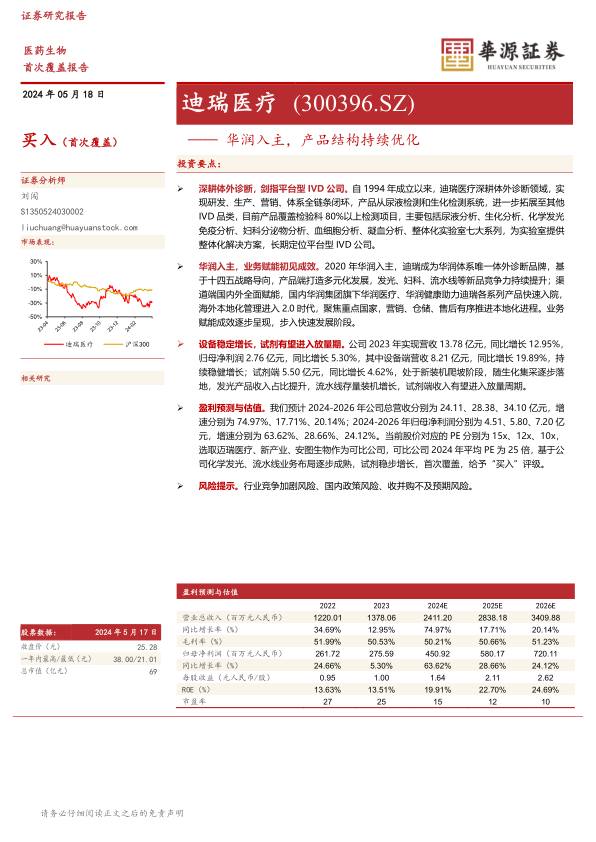 报告分析指出,迪瑞医疗的业务发展呈现“设备先行,试剂上量”的特点。2023年,公司设备端收入实现近20%的稳健增长,为后续试剂收入的放量奠定了坚实基础。随着新装机设备的逐步磨合以及生化集采的落地,化学发光产品收入占比的提升和流水线存量装机的增长,预计将共同推动试剂端进入快速放量周期。基于此,报告对迪瑞医疗未来三年的营收和归母净利润给出了积极的增长预测,并首次覆盖给予“买入”评级。