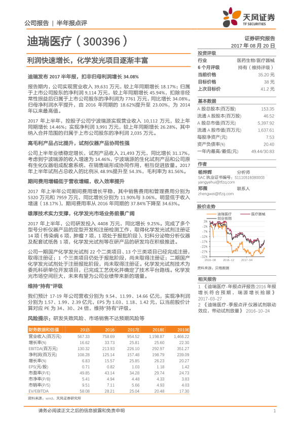 迪瑞医疗2017年上半年业绩表现稳健,营收和利润均实现显著增长,盈利能力持续提升。公司通过优化产品结构,提高高毛利试剂产品占比,并借助试剂和仪器产品的协同效应,实现了业绩的稳定增长。同时,公司积极投入研发,特别是在化学发光领域取得了重要进展,有望在未来为公司带来新的业绩增长点。维持“持有”评级,并对公司未来发展保持乐观态度。