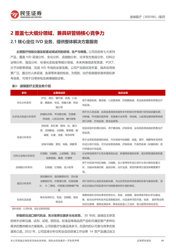迪瑞医疗主营医疗检验仪器及配套试纸试剂的研发、生产与销售,目前产品体系覆盖尿液分析、生化分析、血细胞分析、化学发光免疫分析、妇科分泌物分析、凝血分析、标准化实验室等七大细分领域,并计划未来进军质谱、POCT、分子诊断等领域,以实现IVD市场的全面发展。公司积极抓住进口替代机遇,2022年有14款产品通过了第八批优秀国产医疗设备技术参数和企业情况评审,产品体系正逐步向智能化、集约化转变。