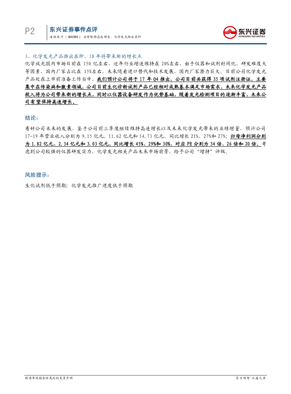 看好公司未来的发展,鉴于公司前三季度继续维持高速增长以及未来化学发光带来的业绩增量,预计公司17-19年营业收入分别为9.15亿元、11.62亿元和14.73亿元,同比增长21%、27%和27%;归母净利润分别为1.82亿元、2.34亿元和3.03亿元,同比增长45%、29%和30%,对应PE分别为34倍、26倍和20倍。考虑到公司较强的仪器研发实力,化学发光相关产品未来市场前景,给予公司“增持”评级。