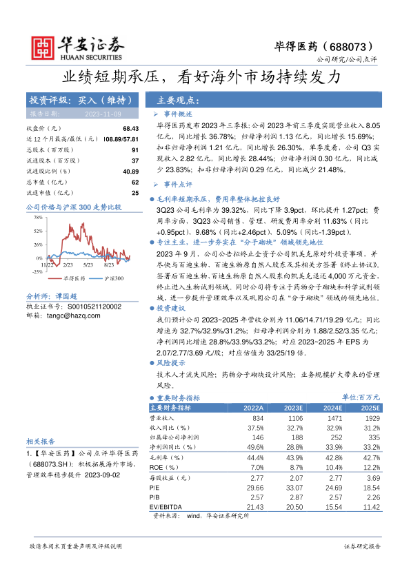 本报告对毕得医药2023年三季报进行了深入分析,认为公司短期业绩承压,但通过专注主业和战略调整,有望在海外市场实现持续增长。报告维持“买入”评级,并给出了未来三年的盈利预测和估值,同时提示了相关风险。总体而言,报告认为毕得医药具有较好的投资价值。