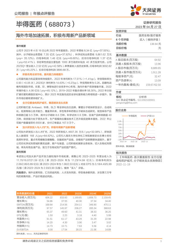 考虑到公司加大新产品开发力度和海外市场拓展,分析师上调了公司2023-2025年的营业收入预测至11.70/16.07/21.59亿元(原预测为11.23/14.84亿元),归母净利润预测至2.06/2.85/3.89亿元(原预测为1.90/2.53亿元)。对应每股收益(EPS)分别为3.18/4.40/5.99元/股。基于此,报告维持对毕得医药的“买入”评级。