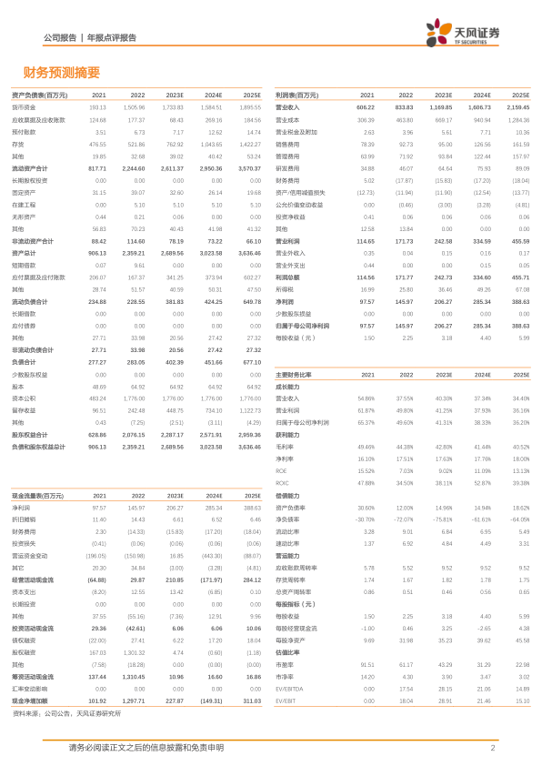 考虑到公司加大新产品开发力度和海外市场拓展,调整公司2023-2025年营业收入为11.70/16.07/21.59亿元(原2023-2024年为11.23/14.84亿元);归母净利润为2.06/2.85/3.89亿元(原2023-2024年为1.90/2.53亿元);对应EPS为3.18/4.40/5.99元/股(原2023-2024为2.93/3.90元/股),维持“买入”评级。