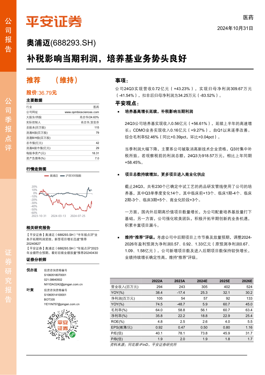 本报告分析了奥浦迈2024年第三季度的经营业绩和项目进展情况。公司培养基业务保持高速增长,但受补税影响,当期利润有所下降。公司后期项目储备充足,业绩增长确定性高,维持“推荐”评级。