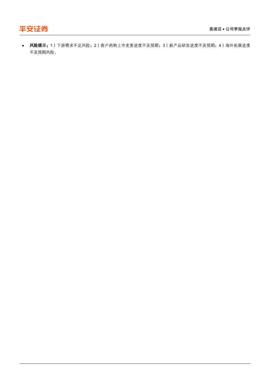 风险提示:1)下游需求不足风险;2)客户药物上市变更进度不及预期;3)新产品研发进度不及预期;4)海外拓展进度不及预期风险。