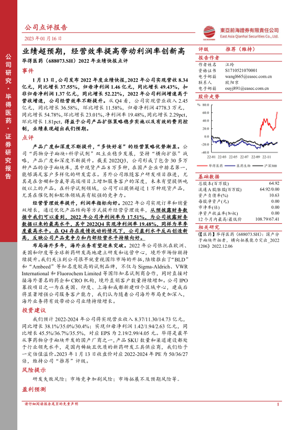 本报告对毕得医药2022年业绩快报进行了深入分析,认为公司业绩超出预期,经营效率显著提高,产品竞争力和内部经营水平持续向好。公司通过“多快好省”的经营策略,不断提升产品广度和深度,满足客户多样化需求。同时,公司积极布局海外市场,有望实现海外业务的突破性增长。维持公司“推荐”评级,并对其未来发展前景持乐观态度。