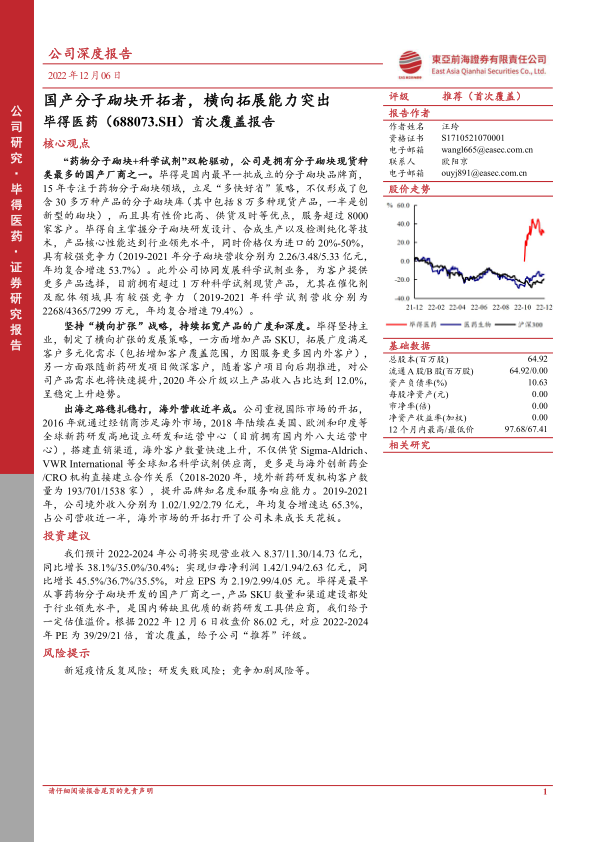 我们预计2022-2024年公司将实现营业收入8.37/11.30/14.73亿元,同比增长38.1%/35.0%/30.4%;实现归母净利润1.42/1.94/2.63亿元,同比增长45.5%/36.7%/35.5%,对应EPS为2.19/2.99/4.05元。毕得是最早从事药物分子砌块开发的国产厂商之一,产品SKU数量和渠道建设都处于行业领先水平,是国内稀缺且优质的新药研发工具供应商,我们给予一定估值溢价。根据2022年12月6日收盘价86.02元,对应2022-2024年PE为39/29/21倍,首次覆盖,给予公司“推荐”评级。
