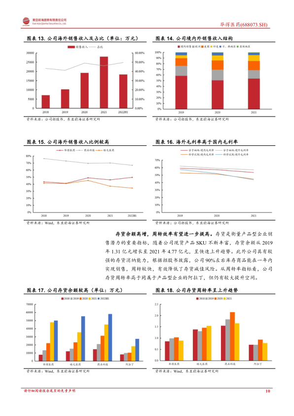 毕得医药近年来业绩实现快速增长。2019-2021年,公司营业收入从2.48亿元增长至6.06亿元,年均复合增速达56.2%;扣非归母净利润从3513万元增长至8988万元,年均复合增速达60.0%。其中,药物分子砌块是公司主要营收来源,占比保持在87.96%-90.87%,年均复合增速为53.7%;科学试剂业务营收规模虽小,但增速迅猛,年均复合增速达79.4%,占比逐年上升。随着营收规模扩大,公司三费费率呈下降趋势,净利率稳步上升,2021年达到16.1%。国际市场是公司业绩增长的重要引擎,2019-2021年海外销售收入从1.02亿元增长至2.79亿元,年均复合增速达65.3%,占总营收比例接近一半(41.17%-48.98%),其中欧洲和美国市场贡献较大。海外市场更高的毛利率和广阔空间为公司打开了成长天花板。此外,公司存货余额从2019年的1.31亿元增长至2021年的4.77亿元,且90%左右的库存商品能在一年内实现销售,存货周转率高于同业公司阿拉丁。