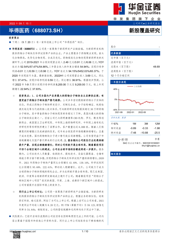 毕得医药(688073):公司是一家聚焦于新药研发产业链前端,为新药研发机构提供药物分子砌块及科学试剂等产品的企业,产品主要服务于药物靶点发现,苗头化合物筛选,先导化合物发现、合成及优化,药物候选化合物发现等新药研发的关键环节。公司2019-2021年分别实现营业收入2.49亿元/3.91亿元/6.06亿元,YOY依次为52.54%/57.47%/54.86%,三年营业收入的年复合增速54.94%;实现归母净利润-0.01亿元/0.59亿元/0.98亿元,YOY依次为94.15%/5452.03%/65.37%,于2020年实现扭亏为盈。最新报告期,2022H1公司实现营业收入3.69亿元,同比增长37.41%;实现归母净利润0.59亿元,同比增长36.91%。根据初步预测,公司2022年1-9月预计实现归母净利润8,200.00万元至9,200.00万元,较上年同期增长22.94%至37.93%。