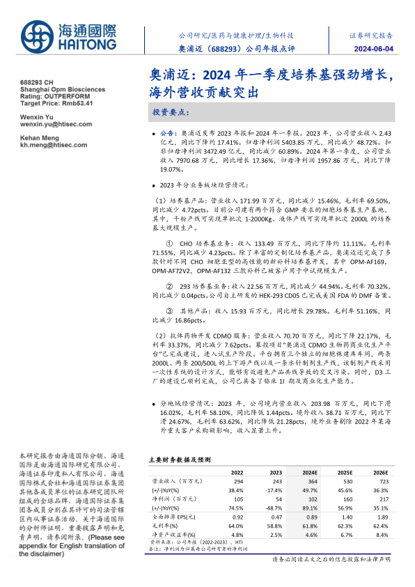 公司年报点评:奥浦迈:2024年一季度培养基强劲增长,海外营收贡献突出