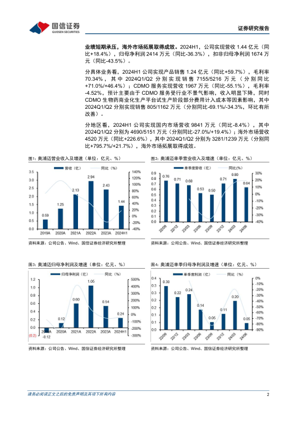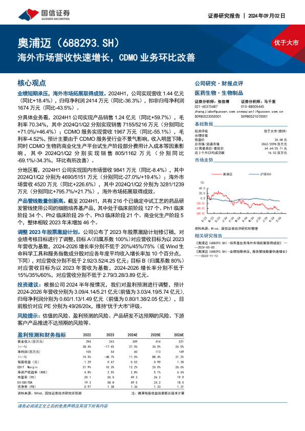 奥浦迈在2024年上半年面临短期业绩承压,归母净利润和扣非归母净利润同比下降。然而,公司在产品销售业务上实现强劲增长,海外市场营收更是呈现爆发式增长,同比增幅高达226.6%,尤其第一季度海外营收同比暴涨795.7%,显示出海外市场拓展的显著成效。尽管CDMO服务业务受行业不景气影响,但第二季度已出现环比改善。公司培养基业务服务客户管线数量持续增加,且CDMO募投项目已进入试运行,为未来业务增长奠定基础。根据最新的盈利预测调整,预计2024-2026年营收将分别达到3.09/4.14/5.21亿元,归母净利润分别为0.60/1.13/1.49亿元,维持“优于大市”评级,表明市场对公司长期发展潜力持乐观态度。