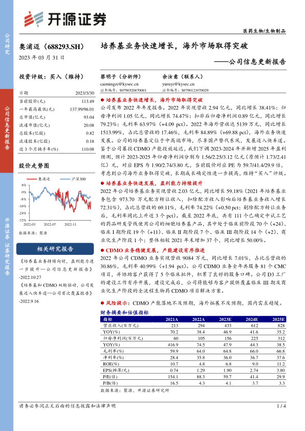 公司海外业务取得突破性进展,2022年海外营收同比增长1513.99%,占比总营收的17.46%,且毛利率高达84.89%。尽管CDMO产能投放延迟导致盈利预测下调,但鉴于海外业务的成功拓展和长期成长确定性,开源证券维持“买入”评级。