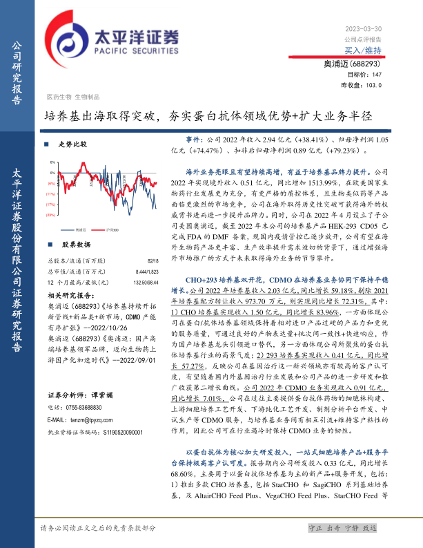 奥浦迈在2022年取得了显著的业绩增长,尤其是在海外市场和培养基业务方面。公司通过加大研发投入,不断优化产品和服务,增强了市场竞争力。维持“买入”评级,主要基于公司在高端培养基市场的领先地位和未来的增长潜力。