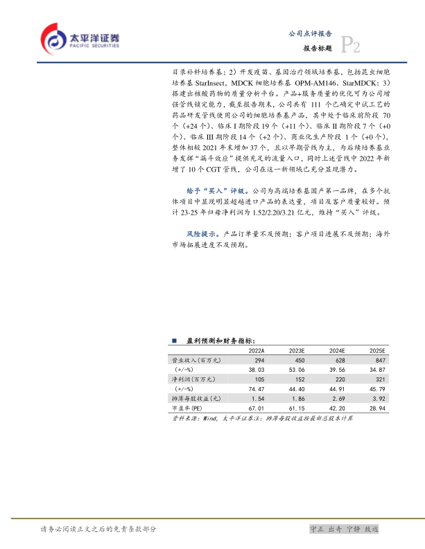 给予“买入”评级。公司为高端培养基国产第一品牌,在多个抗体项目中显现明显超越进口产品的表达量,项目及客户质量较好。预计23-25年归母净利润为1.52/2.20/3.21亿元,维持“买入”评级。