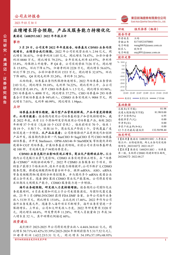 奥浦迈在2022年展现了强劲的业绩增长,营业收入和归母净利润均实现大幅提升。这主要得益于其核心培养基业务的高速发展和CDMO业务的稳健增长。公司在培养基产品创新、管线拓展以及CDMO技术平台建设和产能布局方面均取得了显著进展。同时,国际化战略的成功实施和持续加大的研发投入,为公司未来的可持续发展奠定了坚实基础。尽管存在海外业务波动、产品价格下降和新产品研发不及预期等风险,但基于其强大的业务能力和市场前景,分析师维持了“强烈推荐”的投资评级。