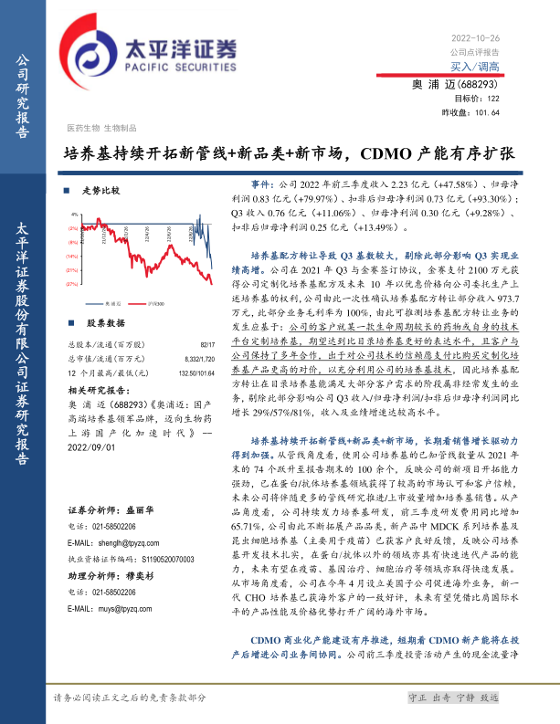 本报告对奥浦迈2022年前三季度的业绩进行了全面分析,认为公司在培养基业务和CDMO业务方面均取得了显著进展。公司通过不断拓展新管线、新品类和新市场,以及CDMO产能的有序扩张,为未来的销售增长提供了强劲动力。维持“买入”评级。