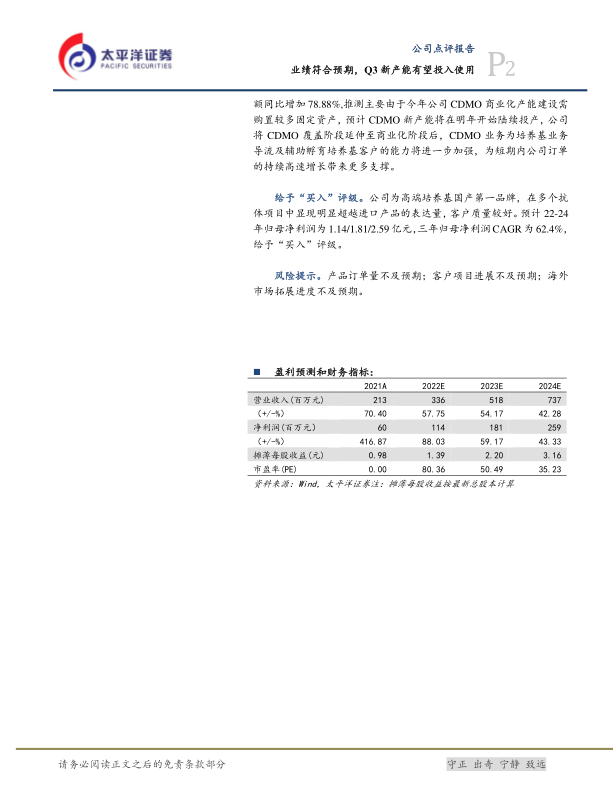 给予“买入”评级。公司为高端培养基国产第一品牌,在多个抗体项目中显现明显超越进口产品的表达量,客户质量较好。预计22-24年归母净利润为1.14/1.81/2.59亿元,三年归母净利润CAGR为62.4%,给予“买入”评级。