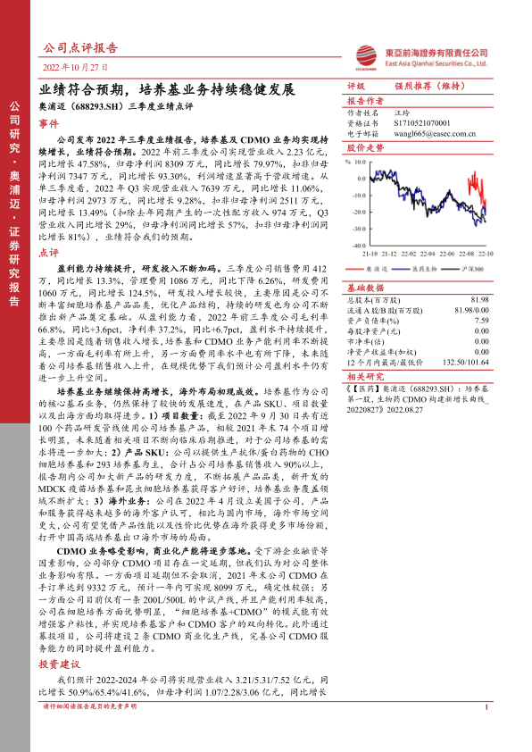 本报告对奥浦迈(688293.SH)2022年三季度业绩进行了点评,维持“强烈推荐”评级。核心观点如下: