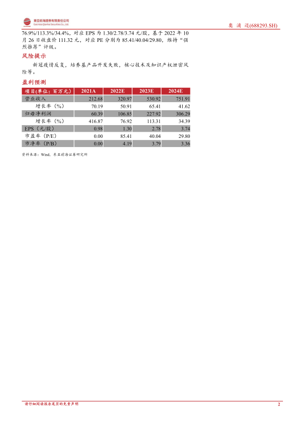 我们预计2022-2024年公司将实现营业收入3.21/5.31/7.52亿元,同比增长50.9%/65.4%/41.6%,归母净利润1.07/2.28/3.06亿元,同比增长76.9%/113.3%/34.4%,对应EPS为1.30/2.78/3.74元/股,基于2022年10月26日收盘价111.32元,对应PE分别为85.41/40.04/29.80,维持“强烈推荐”评级。