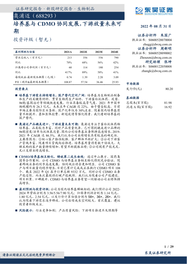 盈利预测与投资评级:公司为国内培养基稀缺标的,我们预计公司2022-2024年营收分别为3.56/5.56/7.90亿元;归母净利润分别为1.14亿元,1.80亿元,2.54亿元,以发行价计算估值分别为58×,36×,26×,我们认为随着下游需求逐步释放,公司后续成长空间较大,首次覆盖,建议投资者积极关注。