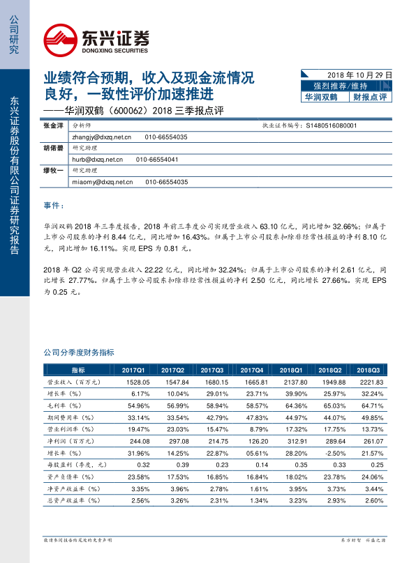 华润双鹤2018年前三季度业绩稳健,收入端和经营性现金流表现良好,未来有望受益于一致性评价的推进。