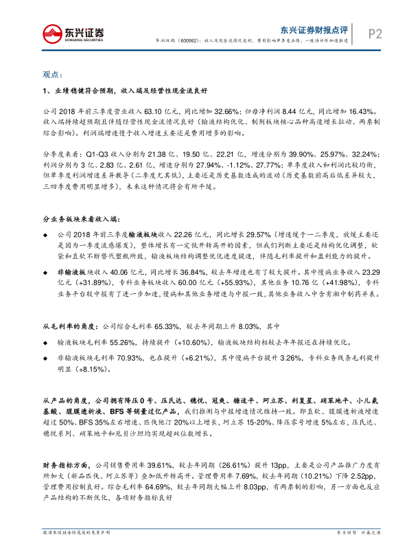 2018三季报点评:业绩符合预期,收入及现金流情况良好,一致性评价加速推进