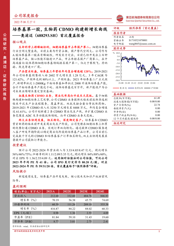 预计公司2022-2024年营业收入为3.33/4.85/8.47亿元,同比增长56%/46%/75%;归母净利润1.11/2.09/3.35亿元,同比增长84%/88%/60%,对应EPS为1.36/2.55/4.09元。运用相对估值法对公司估值,可比公司2023年平均PE为41倍。公司IPO发行定价为80.20元/股,对应2022-2024年PE为59/31/20倍,首次覆盖给予“强烈推荐”评级。