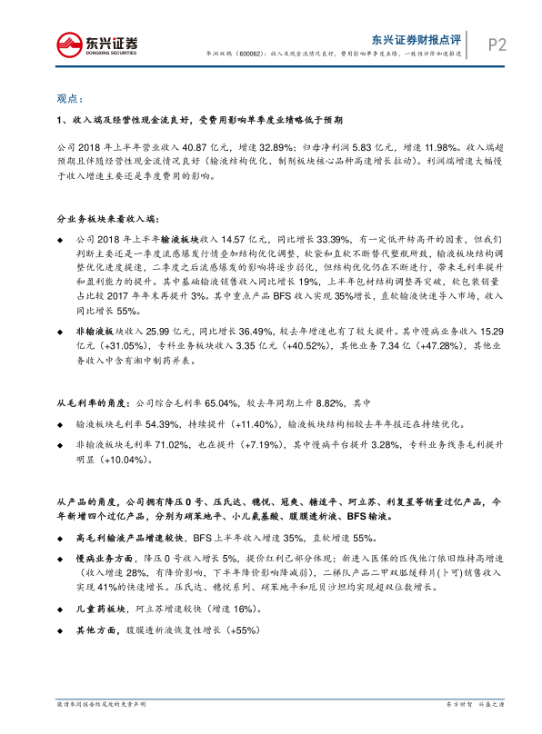 华润双鹤2018年中报显示,公司收入端和经营性现金流表现良好,但受费用影响,单季度业绩略低于预期。公司正经历从输液龙头向化药平台的转型,并通过外延并购丰富产品线,增强盈利能力。