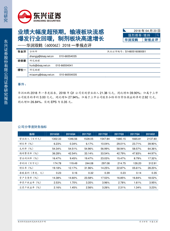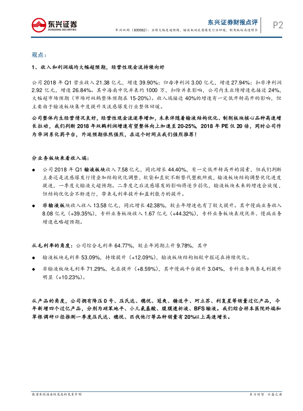 2018一季报点评:业绩大幅度超预期,输液板块流感爆发行业回暖,制剂板块高速增长