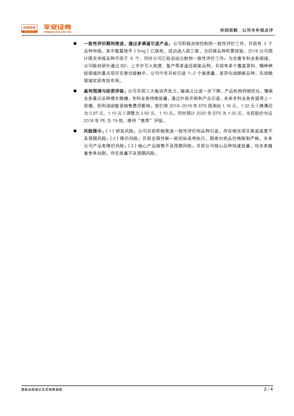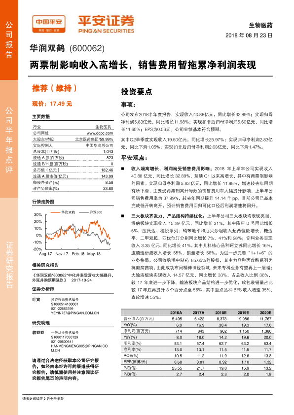 华润双鹤2018年上半年在收入端实现了显著增长,主要得益于三大业务板块的共同发力。然而,受两票制影响,销售费用大幅增加,导致净利润增速放缓。公司积极推进一致性评价,并通过多种渠道引进产品,优化产品结构,为未来发展奠定基础。尽管短期内利润端受到销售费用影响,但长期来看,公司在慢病、专科和大输液领域的多元化布局以及在精神神经领域的拓展,有望带来持续增长动力。维持“推荐”评级,但需关注研发、降价和核心产品销售等风险。