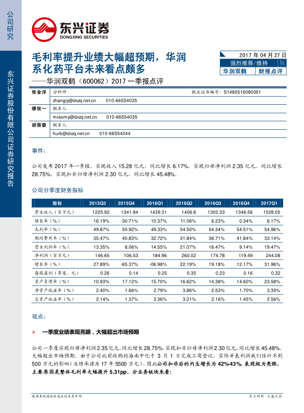 2017一季报点评:毛利率提升业绩大幅超预期,华润系化药平台未来看点颇多