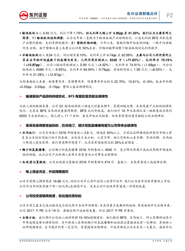 华润双鹤在2017年第一季度展现出强劲的业绩增长,归母净利润同比增长28.75%,扣非归母净利润同比增长45.48%,大幅超出市场预期。这一优异表现主要得益于公司整体毛利率的显著提升(5.31个百分点),以及输液和非输液两大核心业务板块的产品结构优化。高毛利产品如BFS输液和儿科用药珂立苏的贡献尤为突出。此外,医保目录调整为匹伐他汀、缬沙坦氢氯噻嗪等核心品种带来了新的增长机遇。公司拥有16.66亿元的充足现金储备,为未来的外延并购提供了有力支持,且作为华润医药旗下唯一的化药+生物药平台,其外延效率有望进一步提升。鉴于公司从输液龙头向化药平台的成功转型、多重业绩增长驱动因素以及当前被低估的估值水平,东兴证券维持对其“强烈推荐”的评级。预计公司2017-2019年归母净利润将分别达到9.04亿、10.51亿和12.08亿,对应PE分别为18X、16X和14X。