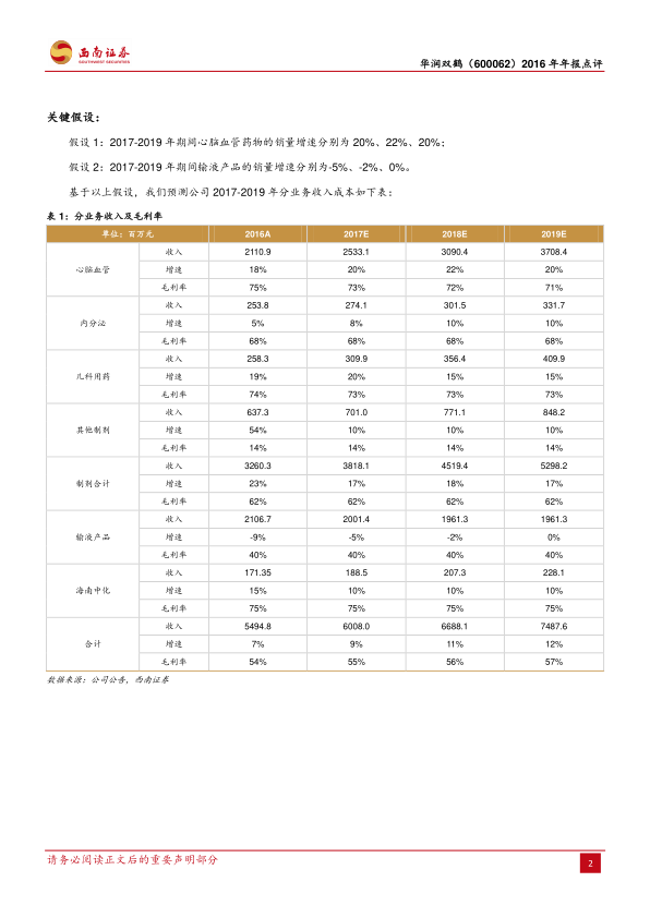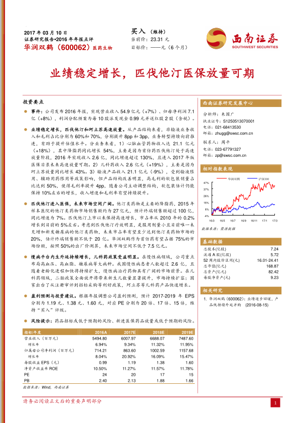 华润双鹤2016年业绩实现稳定增长,营业收入和归母净利润均有提升,非输液业务转型取得积极进展。公司核心产品匹伐他汀在进入医保目录后,凭借其独特的疗效优势和广阔的市场空间,有望成为未来业绩增长的重要驱动力。同时,公司在慢性病和儿科药领域的战略布局,将受益于人口结构变化和国家政策支持,为长期发展奠定基础。尽管面临药品招标和新医保药品放量不及预期的风险,但基于其稳健的业绩表现和核心产品的增长潜力,分析师维持“买入”评级,并对未来三年的盈利能力持乐观态度。
