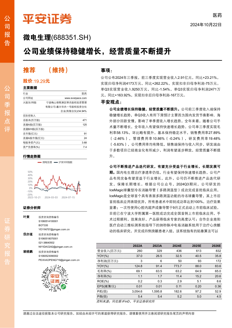 公司不断推进产品迭代研发,有望充分受益于行业增长,长期发展可期。国内电生理治疗渗透率仍低,行业有望保持快速增长趋势,公司产品布局完备有望受益于行业增长,此外,公司仍不断推进产品迭代研发,保障长期增长。根据公司公众号,2024Q3期间,公司研发的IceMagic球囊型冷冻消融导管(多路测温型)成功完成首批临床应用,IceMagic是全球首个具有表面多路测温功能的冷冻球囊导管,其上市后首批临床应用表现优异,所有患者术中即刻成功率达到100%,治疗效果显著;一次性使用心腔内超声成像导管于9月正式启动上市前临床试验,目前已在宁波大学附属第一医院成功完成全国首例上市前临床应用,手术过程顺利,效果良好,产品获得临床专家的高度认可;合作企业商阳医疗启动三维标测系统指导下的纳秒脉冲电场消融系统用于治疗心房颤动的临床研究,并完成四例房颤患者入组,该系统独有的贴靠算法可以