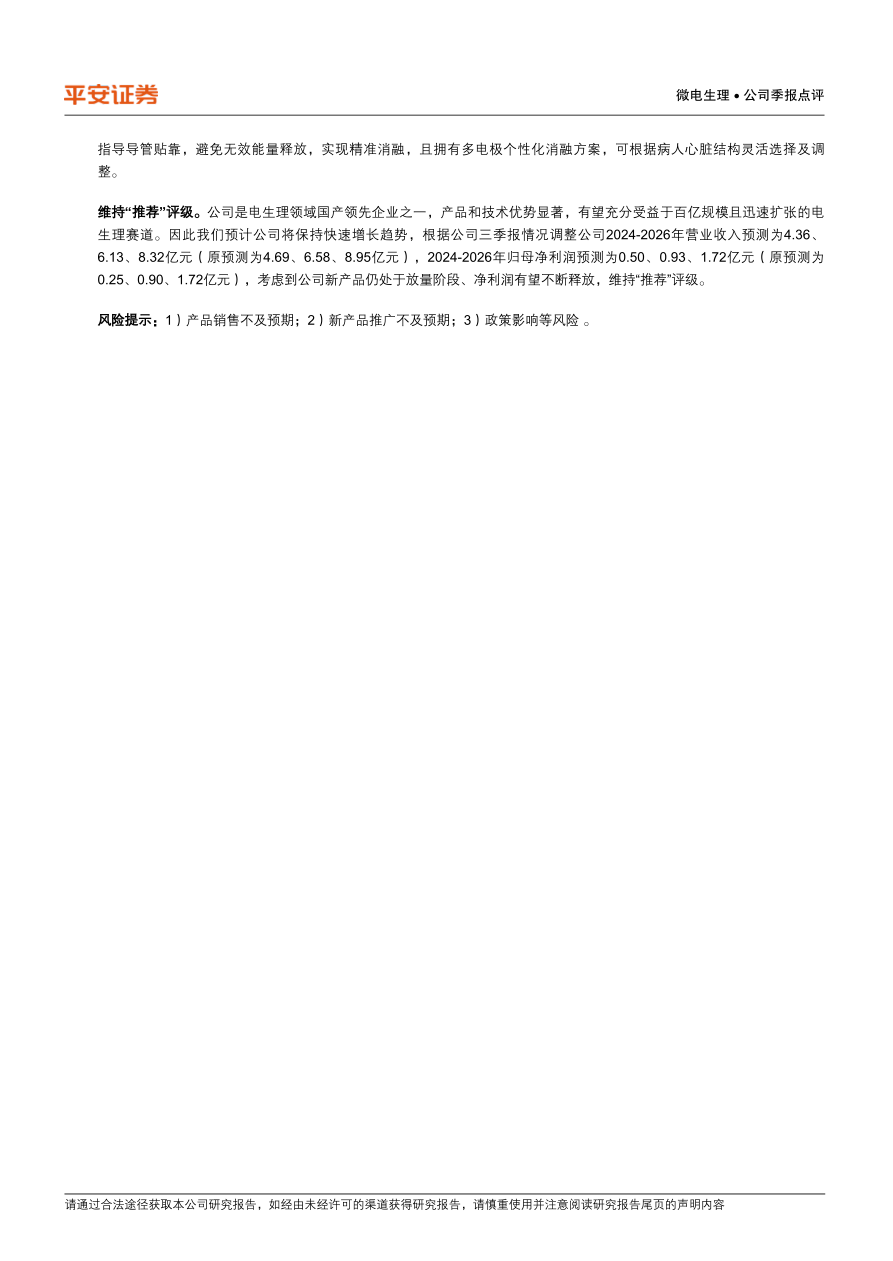 维持“推荐”评级。公司是电生理领域国产领先企业之一,产品和技术优势显著,有望充分受益于百亿规模且迅速扩张的电生理赛道。因此我们预计公司将保持快速增长趋势,根据公司三季报情况调整公司2024-2026年营业收入预测为4.36、6.13、8.32亿元(原预测为4.69、6.58、8.95亿元),2024-2026年归母净利润预测为0.50、0.93、1.72亿元(原预测为0.25、0.90、1.72亿元),考虑到公司新产品仍处于放量阶段、净利润有望不断释放,维持“推荐”评级。