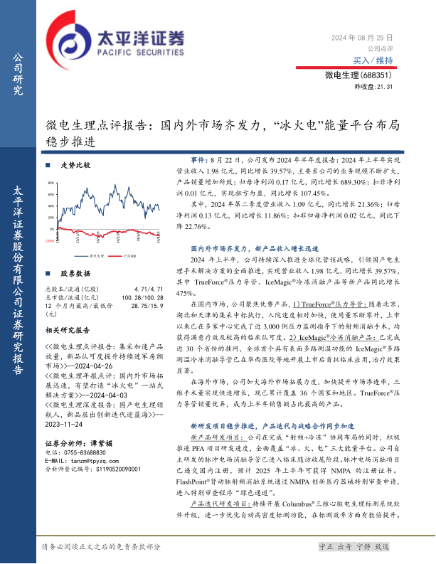 微电生理在2024年上半年展现出强劲的业绩增长势头,营业收入和归母净利润均实现大幅提升,并成功实现扣非净利润扭亏为盈。公司通过积极推进全球化营销战略,在国内和国际市场均取得了显著进展,特别是新产品销售额实现高速增长,有效驱动了整体业绩的提升。