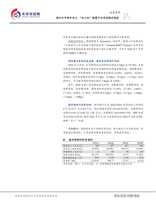 微电生理在2024年上半年取得了令人瞩目的业绩,营业收入和归母净利润均实现大幅增长,并成功实现扣非净利润扭亏为盈,显示出公司强大的市场拓展能力和盈利改善潜力。公司通过深化全球化营销战略,有效推动了国内外市场的扩张,特别是新产品如TrueForce®和IceMagic®的销售表现突出,成为业绩增长的重要驱动力。在研发方面,公司积极布局“冰、火、电”全能量平台,多项创新产品和战略合作项目进展顺利,有望在未来进一步丰富产品线并提升核心竞争力。同时,公司在期间费用管控方面取得了显著成效,有效提升了整体净利率。基于上述积极表现和未来发展潜力,分析师维持了对微电生理的“买入”评级,并对其未来几年的业绩增长持乐观预期。