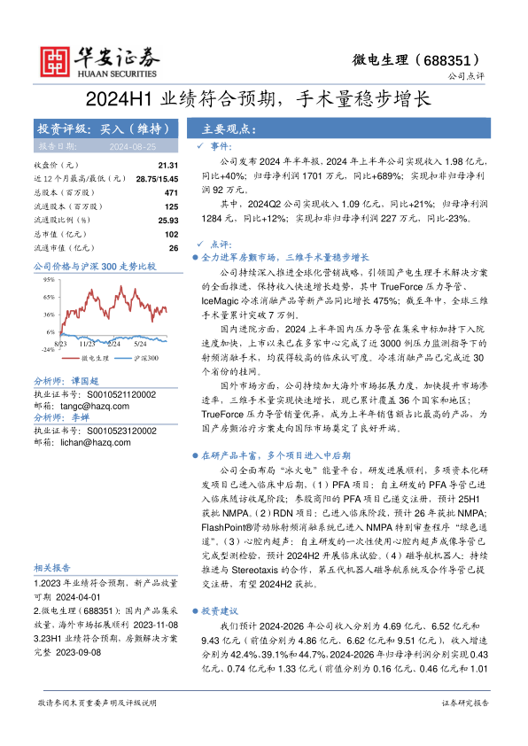 微电生理2024年上半年业绩表现亮眼,房颤市场拓展顺利,三维手术量稳步增长,新产品销售额占比提升,海外市场也取得积极进展。公司在研产品线丰富,多个项目进入临床中后期,有望在未来几年内陆续获批上市,为公司带来新的增长点。维持“买入”评级,但需关注新产品商业化、行业竞争格局和在研临床进展等风险。